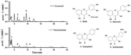 Antioxidative activity is one of the most important factors to evaluate the quality of fermented tea. However, this activity typically depends upon the composition of chemical compounds in tea. After 7-day fermentation, the contents of some compounds in HRL increased, whereas those of other compounds increased, with some new products being generated (Figure 5). Among them, the content of rutin reduced from 4.61 ± 0.13 mg/g to 0.92 ± 0.05 mg/g after fermentation. The contents of quercetin, kaempferol, and isorhamnetin were detected to be 0.64 ± 0.01 mg, 0.48 ± 0.01 mg and 0.85 ± 0.03 mg, respectively, in one gram of dry fermented HRL, whereas the content of these flavonol aglycones in the non-fermented HRL was very low (Table 1). Furthermore, the three different evaluation standards showed that antioxidant activities of fermented HRL were enhanced significantly (p < 0.01, Table 1) compared with that of the non-fermented HRL. These findings were consistent with the report when Angelica dahurica was employed as the substrate [43], where it claimed that the increased content of phenolic compounds in the fermented samples would be responsible for the enhancement of antioxidant activities. Therefore, the changes in the composition of the fermented products by E. amstelodami BSX001 would greatly affect their bioactive properties.