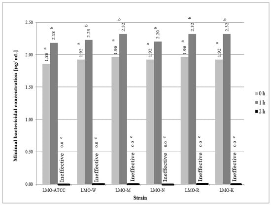 Effectiveness of ozonated water against the tested strains of L. monocytogenes (LMO-ATCC—L. monocytogenes ATCC 19111, LMO-W—strain isolated from vegetables, LMO-M—strain isolated from meat, LMO-N—strain isolated from dairy products, LMO-R—strain isolated from fish, LMO-K—clinical strain.; a,b,c—variables with different letters are statistically different (p ≤ 0.05).
