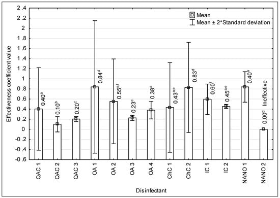 Values of efficacy coefficients for the tested disinfectants, including their belonging to distinguished groups (QAC—quaternary ammonium compounds, OA—oxidizing agents, ChC—chlorine compounds, IC—iodine compounds, NANO—nanoparticles); a–g—variables with different letters are statistically different (p ≤ 0.05)