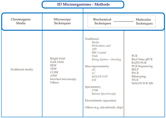 Methods for microorganism identification: chromogenic media and microscopy, biochemical and molecular techniques.