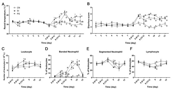Immediately prior to S. Infantis challenge, the total number of peripheral blood leukocytes was not significantly different. Compared with the CN group, an increased peripheral blood leukocyte count was observed at 12 h after S. Infantis challenge in the SI group (p = 0.025; Figure 2C) but not in the PS group. A continued high percentage of banded neutrophils was observed in the SI group from 6 to 48 h after challenge (p = 0.007, p = 0.008, p < 0.001, and p < 0.001, respectively; Figure 2D). Although the percentage of banded neutrophils in the PS group increased at 24 h and 48 h after challenge (p = 0.001 and p < 0.001, respectively), it was lower than the SI group at 24 h (p = 0.049). Compared with the CN group, the SI group exhibited a decrease in the percentage of segmented neutrophils at 24 h after S. Infantis challenge (p = 0.015; Figure 2E). We also observed a decrease in the proportion of lymphocytes in the SI and PS groups at 48 h (p = 0.010 and p = 0.036, respectively; Figure 2F).