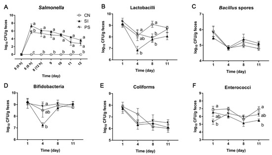 Effects of LBB-mix on the composition of fecal microbiota during S. Infantis infection. (A) Salmonella, (B) lactobacilli, (C) Bacillus spores, (D) bifidobacteria, (E) coliforms and (F) enterococci. Fresh fecal samples from all the piglets were collected on days 1, 4, 8 and 11 after weaning. Results are presented as log10 CFU/g feces, and all counts were performed in triplicate. Data are presented as the mean ± SEM (n = 8 per group). Within the same time, mean values with different superscript letters (a, b) are significantly different (p < 0.05).