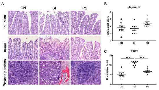 The Salmonella-infected pigs exhibited epithelial cells necrosis and abscission, mucosal hyperemia, submucosa edema, inflammatory cell infiltration, and lymphoid follicle emptying, whereas LBB-mix pretreatment tempered the severity of Salmonella-associated pathological injury and inflammation (Figure 4A). In the jejunal tissue, the histologic score between each group was not significantly different (Figure 4B). In the ileum, the histologic score in the SI group was higher than that in the CN and PS groups (p < 0.001 and p < 0.001, respectively; Figure 4C). Due to weaning stress, pigs in the CN group experienced slight structural damage.