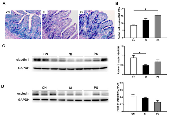 During infection, the goblet cells in the PS group showed vacuoles containing a large amount of mucus (Figure 5A). There was no difference between CN and SI pigs with respect to the number of goblet cells in the ileum. However, the number of ileum goblet cells was higher in LBB-mix pretreatment pigs than in CN pigs (p = 0.011; Figure 5B). Western blot analysis revealed a reduction in the expression of claudin 1 in the ileum of SI pigs compared with CN pigs (p = 0.030; Figure 5C), pretreatment with LBB-mix can save claudin 1 from its decline. However, there were no differences in the expression of occludin among these three groups (Figure 5D).