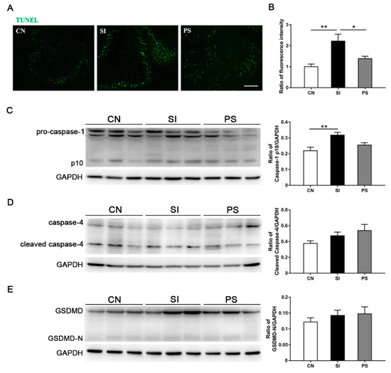 Compared with the CN group, the DNA damage detected by TUNEL staining in the SI group was upregulated dramatically (p = 0.002; Figure 6B). Pretreatment with LBB-mix reduced the degree of DNA damage after S. Infantis challenge (p = 0.029). The expression level of caspase-1 p10 in the SI group was significantly higher than that in the CN group (p = 0.005; Figure 6C), and this increase disappeared by oral administration of LBB-mix. Western blot analysis revealed no difference in the expression of cleaved caspase-4 (Figure 6D) and GSDMD-N (Figure 6E) among the three groups.