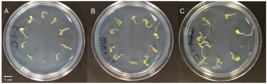 Trifolium repens seedlings 14 days after inoculation with Pantoea sp. Isolate 5 (A), Pantoea sp. Isolate RiLB4 (positive control) (B), and bacteria free control (C). Cotyledons inoculated with isolate 5 are pale and necrotic compared to the positive and bacteria free controls.