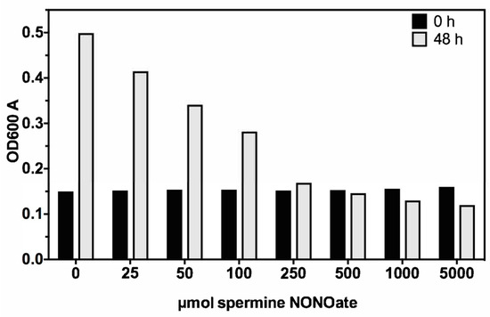 A dose response effect of MAC104 growth inhibition was investigated for a 0 to 5000 μmol concentration range of the spermine NONOate (Figure 1). While we found that 250–5000 μmol spermine NONOate similarly inhibited the bacterial growth during 48 h of incubation, 100 μmol concentration was near the threshold of sensitivity and, thus, this concentration was used in the transposon library screen to isolate nitric oxide sensitive mutants.