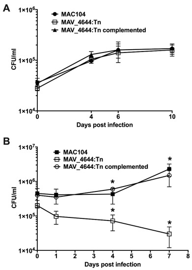 Inactivation of MAV_4644 gene. (A) Comparison of in vitro growth of wild-type MAC104, MAV_4644 gene knockout and complemented strain in the aerated 7H9 medium supplemented with OADC. (B) Survival of MAC104 (black squares), MAV_4644:Tn (open squares) and MAV_4644:Tn complemented clone (open circles) in murine macrophages. RAW264.7 cells were cultured in DMEM supplemented with 10% FBS in 24-well plates and infected with either the wild-type MAC104 or MAV_4644:Tn mutant for 2 h at 37 °C and 5% CO2. The cells were washed twice with HBSS and incubated for an additional 2 h in culture medium supplemented 200 µg/mL of gentamicin. Monolayers were washed and supplemented with 10 ng/mL of murine IFN-γ in DMEM. At reported time points, macrophages were lysed with 0.1% Triton X-100, serially diluted, plated on 7H10 agar plates and incubated at 37 °C for 8–10 days before colonies were counted for CFU. Survival results of the wild-type and complemented strain versus mutant were analyzed using Student’s t test. *, p < 0.05 was determined significant.