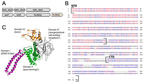 Due to the nearly identical N-terminal regions of MAV_4644 protein and CpnT, we hypothesized that the CTD of MAV_4644 also undergoes proteolytic cleavage before secretion or is present on the outer membrane of MAH and is capable to interact with host proteins [35]. The MAV_4643 and MAV_4642 proteins, highly similar to esat6-like secreted proteins of M. tuberculosis, are most likely exported by the oligimerized MAV_4644 NTD pore [34].
