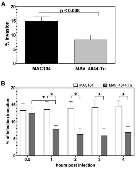 (A) The percentage of invasion of the wild-type MAC104 and MAV_4644:Tn clone. RAW264.7 cells were cultured in DMEM supplemented with 10% FBS in 24-well plates and infected with either the wild-type MAC104 or MAV_4644:Tn mutant for 2 h at 37 °C and 5% CO2. The cells were washed twice with HBSS, incubated for an additional 2 h in culture medium supplemented 200 µg/mL of gentamicin, and then lysed with 0.1% Triton X-100. The present of uptake was calculated by dividing cfu/mL at time 0 to the initial inoculum and multiplying by 100. The Student’s t-test was used to determine p-values as reported. (B) The percentage of MAC104 (white bars) and MAV_4644:Tn (grey bars) survival within 4 h of THP-1 macrophages infection. THP-1 macrophages were cultured in 48-well plates as describe above, and then infected with MAC104 or MAV_4644:Tn at an MOI of 10 for 30 min at 37 °C and 5% CO2. All monolayers were washed twice with HBSS and selected wells were lysed at 30 min for time 0, while RPMI-1640 supplemented with 10% FBS was replaced in the rest of the wells for subsequent time points. Cells were lysed with 0.1% Triton X-100, serially diluted, plated on 7H10 agar plates and CFU counts were recorded. Survival of the wild-type versus mutant was analyzed using Student’s t test. *, p < 0.05 was determined significant.