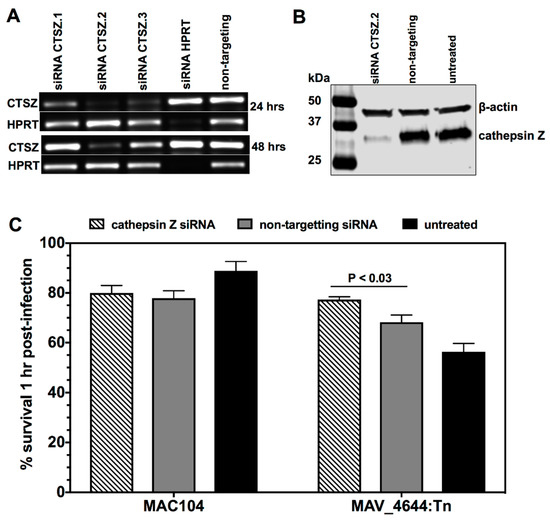 THP-1 cells were seeded to 60% confluency in 48-well plates and differentiated with 20 ng/mL of PMA in RPMI-1640 (Corning) supplemented with 10% FBS (Gemini, New York, NY, USA) for 24 h, at which point the medium was replenished. Cells were rested an additional 24 h. The culture medium was refreshed again just before adding the freshly prepared transfection complex. The transfection complex was prepared with either cathepsin Z interfering RNA designed at Custom Dicer-Substrate siRNA (Integrative DNA Technologies, IDT, Coralville, IA, USA) or non-targeting interfering RNA (IDT) and Viromer® Green transfection reagent (Lipocalyx, Houston, TX, USA) following the manufacturer’s protocol and with the following specifications: the working volume per well was 500 mL and each transfection complex was made at 100 nM siRNA in 50 µL of Viromer Green buffer. The uptake of transfection complex was verified with the TYE 563 Transfection Control (IDT). The transfection medium was replaced at 24 h with RPMI-1640 supplemented with 10% FBS (Gemini) and refreshed in 24 h intervals for 3 days. Cells were then infected with the wild-type MAC104 and MAV_4644:Tn. At each time points, cells were lysed to examine bacterial survival and assess CTSZ protein levels. The cell lysates were resolved with SDS-PAGE, transferred to a nitrocellulose membrane, probed with cathepsin Z (ThermoFisher Scientific, San Jose, CA, USA) and B-actin (Abcam, Boston, MA, USA) antibodies and visualized with a LI-COR imaging system (Lincoln, NE, USA).
