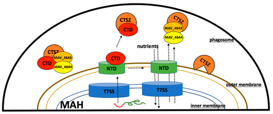 Hypothetical model of MAV_4644 protein interaction with cathepsin Z in the macrophage phagosome. MAV_4644 protein is transported via T7SS and assembles on the outer membrane. CTD is secreted through proteolytic cleavage, allowing CTD to interact with CTSZ, and opening NTD to transport nutrients and proteins. T7SS: type 7 secretion system, NTD: MAV_4644 protein N-terminal domain, CTD: MAV_4644 protein C-terminal domain, CTSZ: cathepsin Z protein.