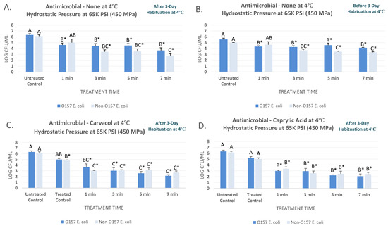 Inactivation of six-strain cocktail of habituated and non-habituated E. coli O157:H7 (ATCC® numbers BAA 460, 43888, 43894, 35150, 43889, 43890) and the ‘Big Six’ non-O157 E. coli mixtures (ATCC® numbers BAA 2196, BAA 2193, BAA 2215, BAA 2440, BAA 2219, BAA 2192) in sterilized blueberry juice, treated by carvacrol (0.5%), caprylic acid (0.5%) and elevated hydrostatic pressure at 450 MPa (Barocycler Hub880 Explorer, Pressure Bioscience Inc., South Easton, MA, USA) for 0, 1, 3, 5, and 7 min at 4 °C. In each graph, and for each pathogen mixture separately, columns of each time interval followed by different uppercase letters are representing log CFU/mL values (Mean ± SE) that are statistically (p < 0.05) different (Tukey-adjusted ANOVA). Uppercase letters followed by * sign are statistically (p < 0.05) different than the untreated control (not treated with antimicrobial) (Dunnett’s-adjusted ANOVA). (A) After 3 days of habituation, treated by no antimicrobial at 4 °C; (B) Before 3 days of habituation, treated by no antimicrobial at 4 °C; (C) After 3 days of habituation, treated by 0.5% carvacrol at 4 °C; (D) After 3 days of habituation, treated by 0.5% caprylic acid at 4 °C.