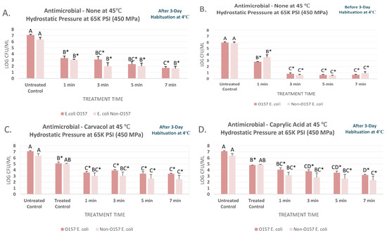 Inactivation of six-strain cocktail of habituated and non-habituated E. coli O157:H7 (ATCC® numbers BAA 460, 43888, 43894, 35150, 43889, 43890) and the ‘Big Six’ non-O157 E. coli strain mixtures (ATCC® numbers BAA 2196, BAA 2193, BAA 2215, BAA 2440, BAA 2219, BAA 2192) in sterilized blueberry juice, treated by carvacrol (0.1%), caprylic acid (0.1%) and elevated hydrostatic pressure at 450 MPa (Barocycler Hub880 Explorer, Pressure Bioscience Inc., South Easton, MA, USA) for 0, 1, 3, 5, and 7 min at 45 °C. In each graph, and for each pathogen mixture separately, columns of each time interval followed by different uppercase letters are representing log CFU/mL values (mean ± SE) that are statistically (p < 0.05) different (Tukey-adjusted ANOVA). Uppercase letters followed by * sign are statistically (p < 0.05) different than the untreated control (not treated with antimicrobial) (Dunnett’s-adjusted ANOVA). (A) After three days of habituation, treated by no antimicrobial at 45 °C; (B) Before three days of habituation, treated by no antimicrobial at 45 °C; (C) After three days of habituation, treated by 0.1% carvacrol at 45 °C; (D) After three days of habituation, treated by 0.1% caprylic acid at 45 °C.