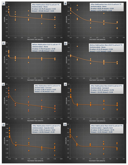 Inactivation rates for six-strain habituated and non-habituated mixture of E. coli O157:H7 (ATCC® numbers BAA 460, 43888, 43894, 35150, 43889, 43890) and the ‘Big Six’ non-O157 E. coli strain mixtures (ATCC® numbers BAA 2196, BAA 2193, BAA 2215, BAA 2440, BAA 2219, BAA 2192) exposed to 0.5% carvacrol, 0.5% caprylic acid, and elevated hydrostatic pressure at 450 MPa (Barocycler Hub 440, Pressure BioScience Inc., South Easton, MA) in sterilized blueberry juice at 4 °C. Using the GInaFiT software, the provided Kmax values are selected from the best-fitted model (goodness-of-fit indicator of R2 values, α = 0.05). Kmax values indicate the expressions of number of log cycles of reduction in 1/min unit for each pressure/temperature combinations. Presented D-values are calculated based on best-fitted linear model, showing time required for one log (90%) of microbial cell reductions of the microbial cell mixture. (A) Habituated E. coli O157 treated by no antimicrobial at 4 °C with R2 = 0.53; (B) Habituated E. coli non-O157 treated by no antimicrobial at 4 °C with R2 = 0.64; (C) Non-habituated E. coli O157 treated by no antimicrobial at 4 °C with R2 = 0.48; (D) Non-habituated E. coli non-O157 treated by no antimicrobial at 4 °C with R2 = 0.56; (E) Habituated E. coli O157 treated by carvacrol (0.5%) at 4 °C with R2 = 0.69; (F) Habituated E. coli non-O157 treated by carvacrol (0.5%) at 4 °C with R2 = 0.78; (G). Habituated E. coli O157 treated by caprylic acid (0.5%) at 4 °C with R2 = 0.81; (H). Habituated E. coli non-O157 treated by caprylic acid (0.5%) at 4 °C with R2 = 0.75.