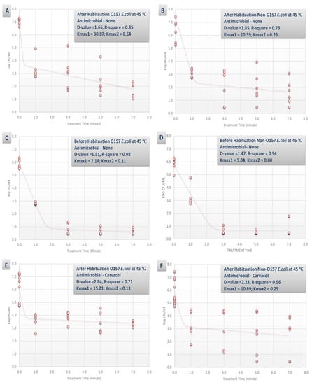 The D-value for STEC for habituated and non-habituated samples (Figure 3A,C) emphasizes on importance of this practice on outcome of a challenge study. The D-value associated with habituated STEC were 13.70 min while for non-habituated samples this inactivation index was 7.76 min (Figure 3A,C). This effect was not observed at higher temperature. At 45 °C, the D-values were similar for habituated and non-habituated STEC samples and were 1.65 and 1.51 min, respectively (Figure 3A,C).