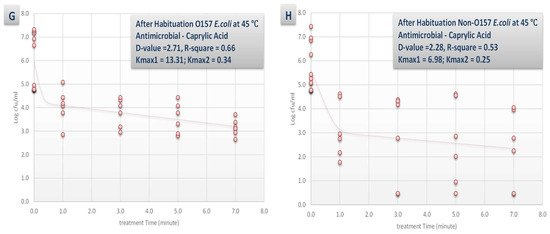 Inactivation rates for six-strain habituated and non-habituated mixture of E. coli O157:H7 (ATCC® numbers BAA 460, 43888, 43894, 35150, 43889, 43890) and the ‘Big Six’ non-O157 E. coli strain mixtures (ATCC® numbers BAA 2196, BAA 2193, BAA 2215, BAA 2440, BAA 2219, BAA 2192) exposed to 0.1% carvacrol, 0.1% caprylic acid, and elevated hydrostatic pressure at 450 MPa (Barocycler Hub 440, Pressure BioScience Inc., South Easton, MA) in sterilized blueberry juice. Using the GInaFiT software, the provided Kmax values are selected from the best-fitted model (goodness-of-fit indicator of R2 values, α = 0.05). Kmax values indicate the expressions of number of log cycles of reduction in 1/min unit for each pressure/temperature combinations. Presented D-values are calculated based on best-fitted linear model, showing time required for one log (90%) of microbial cell reductions of the habituated microbial cell mixture. (A) Habituated E. coli O157 treated by no antimicrobial at 45 °C with R2 = 0.53; (B) Habituated E. coli non-O157 treated by no antimicrobial at 45 °C with R2 = 0.64; (C) Non-habituated E. coli O157 treated by no antimicrobial at 45 °C with R2 = 0.48; (D) Non-habituated E. coli non-O157 treated by no antimicrobial at 45 °C with R2 = 0.56; (E) Habituated E. coli O157 treated by carvacrol (0.1%) at 45 °C with R2 = 0.69; (F) Habituated E. coli non-O157 treated by carvacrol (0.1%) at 45 °C with R2 = 0.78; (G) Habituated E. coli O157 treated by caprylic acid (0.1%) at 45 °C with R2 = 0.81; (H) Habituated E. coli non-O157 treated by caprylic acid (0.1%) at 45 °C with R2 = 0.75.