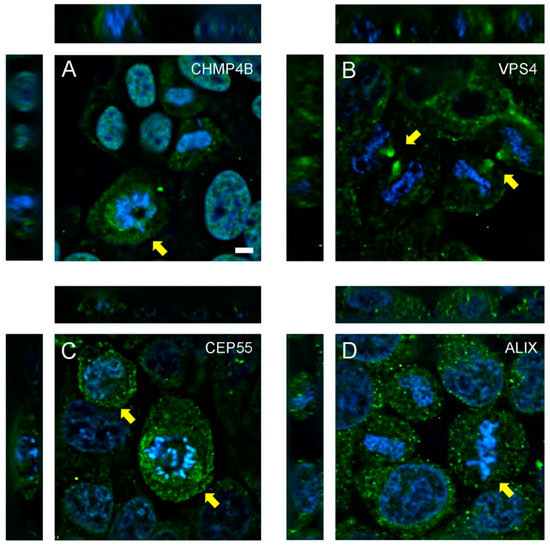 Localization and recruitment of abscission proteins in HeLa cells. HeLa cells were seeded onto glass chamber slides and fixed after 24 h, then stained with antibodies to (A) CHMP4B, (B) VPS4, (C) CEP55, or (D) ALIX. Proteins (green) and DAPI-labeled nuclei (blue) are shown. Z-stacking was performed to confirm localization and recruitment of proteins during various stages of mitosis, including abscission. Yellow arrows highlight specific recruitment or upregulation of abscission proteins within dividing cells. Scale bar = 10 µm.