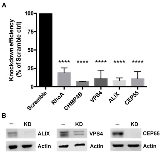 Knockdown of host abscission proteins. (A) Knockdown efficiency was measured by RT-PCR; values for each target are presented as a percent of gene expression compared to cells treated with a non-targeting siRNA (Scramble) control. Data points show mean ± SEM, n = 3. Statistics were performed using one-way ANOVA with Dunnett’s multiple comparisons post-test. **** denotes a p value < 0.0001. (B) HeLa cells treated with scramble siRNA (−), or treated with siRNA (KD) for VPS4, ALIX, or CEP55, and actin control.