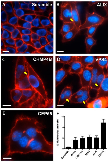 Failure of cells to effectively complete abscission can result in multiple or fragmented nuclei, or single and multiple midbodies within dividing cells. To examine these unique abscission defects, cells were depleted of a single abscission protein, and imaged by live fluorescence microscopy. Cells treated with a non-targeting scramble siRNA had a low percentage of multinucleated cells, 0.62% of cells in the monolayer (Figure 3A,F). Depletion of ALIX, CHMP4B, VSP4, and CEP55, all resulted in an increase in the number of multinucleated cells: 5.1%, 4.8%, 5.3%, and 12.1%, respectively (Figure 3B–F). An increase in cell multinucleation was also found in cells depleted of the small GTPase RhoA, which functions upstream of abscission protein recruitment during cytokinesis (Figure 3F). Even with robust protein depletion, this relatively low percent of multinucleated cells has been previously reported, and is likely due to strong mitotic defects masking downstream abscission defects [13]. Additional abscission failure phenotypes were also commonly observed in our analysis, including intact cell midbodies and fragmented nuclei, confirming that abscission failure occurred following knockdown of individual abscission targets.