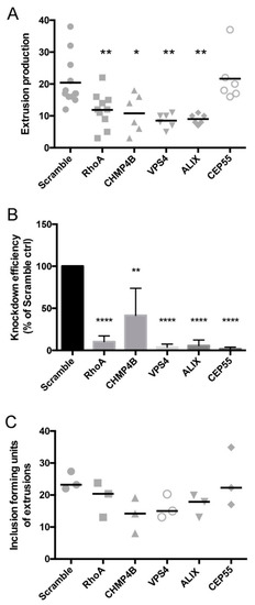 3.5. Depletion of Abscission Proteins Partially Inhibited Extrusion Production