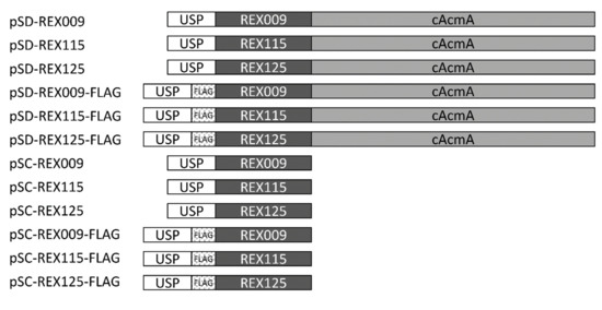 The rex009, rex115, and rex125 genes were amplified by PCR from original plasmids carrying sequences of REX009, REX115, and REX125 proteins [12], using ILP030-F/Rex009-R-Eco, ILP030-F/Rex115-R-Eco, and ILP030-F/Rex125-R-Eco primer pairs, respectively. All amplicons were cloned to a pSDLBA3b plasmid for surface display [19] via BamHI/EcoRI restriction sites (yielding pSD-REX009, pSD-REX115, and pSD-REX125). Similarly, genes were amplified using primer pairs ILP030-F/Rex009-R-Xba, ILP030-F/Rex115-R-Xba, and ILP030-F/Rex125-R-Xba, and cloned to a pSDLBA3b plasmid via BamHI/XbaI, thereby yielding a pSC-REX series (pSC-REX009, pSC-REX115, and pSC-REX125) that enables secretion. To insert a FLAG-tag nucleotide sequence upstream of rex sequences in all pSD-REX and pSC-REX plasmids, the usp45 sequence was amplified from pSDLBA3b using primers Usp1-NcoI/FLAG_Bam_R, digested with NcoI/BamHI, and cloned into equally treated plasmids. This yielded plasmids pSD-REX009-FLAG, pSD-REX115-FLAG, pSD-REX125-FLAG, pSC-REX009-FLAG, pSC-REX115-FLAG, and pSC-REX125-FLAG.