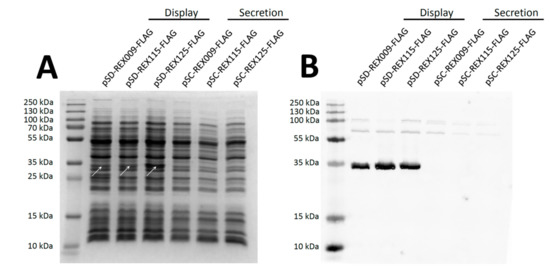 Detection of FLAG-tagged REX fusion proteins in the cell lysate of L. lactis. (A) SDS-PAGE stained with Coomassie Brilliant Blue. (B) Western blotting with an anti-FLAG-tag antibody. REX proteins are in fusion with the Usp45 secretion signal (Secretion), or with the Usp45 secretion signal and a cAcmA surface anchor (Display).