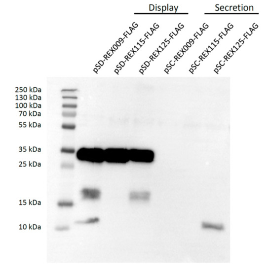 Overnight cultures of L. lactis NZ9000 transformed with the appropriate plasmid (pSD-REX009, pSD-REX115, pSD-REX125, pSC-REX009, pSC-REX115, pSC-REX125, pSD-REX009-FLAG, pSD-REX115-FLAG, pSD-REX125-FLAG, pSC-REX009-FLAG, pSC-REX115-FLAG, pSC-REX125-FLAG, or pNZ8148—an empty plasmid control) were diluted (1:100) in 10 mL or 50 mL of fresh GM-17 medium, and grown to optical density A600 = 0.80. Fusion protein expression was induced with 25 ng/mL nisin (Fluka Chemie AG, Buchs, Switzerland). After three hours of incubation, 1 mL of culture was stored at 4 °C for flow cytometry, and the remaining cell culture was centrifuged at 5000× g for 10 min. The cell pellet was resuspended in 400 µL of phosphate-buffered saline (PBS, pH 7.4) and stored at –20 °C for SDS-PAGE. Media were filtered through sterile 0.22 µm pore filters (Sartorius, Göttingen, Germany) and concentrated 10-fold using 1K Microsep Advance Centrifugal Devices (Pall, Port Washington, NY, USA).