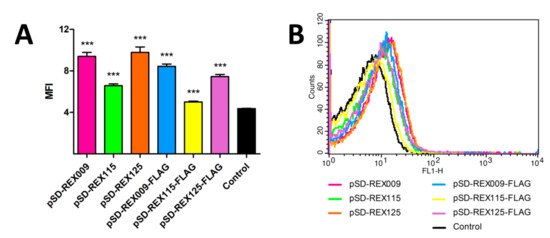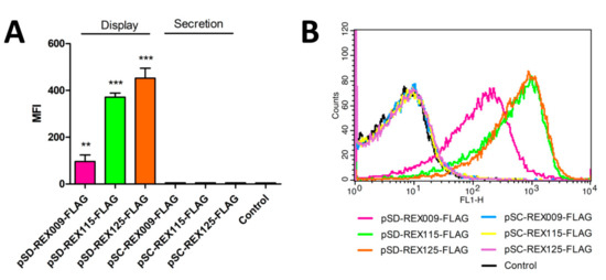 Flow cytometry of L. lactis cells displaying or secreting FLAG-tagged REX variants, detected with an anti-FLAG antibody. Control: L. lactis containing an empty plasmid of pNZ8148. (A) Mean fluorescence intensity (MFI) or (B) the shift in fluorescence intensity of representative measurements are depicted. Error bars denote standard deviations. Significant differences (** p < 0.005, *** p < 0.001; Student’s t-test) are marked with an asterisk.