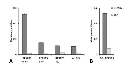 Binding of secreted REX variants in ELISA. The 96-well plate was coated with recombinant IL-23Rex protein, and samples of the medium with secreted REX proteins were applied (A). Purified protein REX115–TolA diluted in PBSTB was used as a positive control (B). The binding of REX proteins to IL-23Rex, and to BSA as a negative control, was detected by anti-DDDDK tag antibody [M2] conjugated with horseradish peroxidase (HRP) (A), or by streptavidin with HRP (B). Each bar represents the mean value with standard deviation and significant differences between mean values of the negative control (no REX), and the samples were analyzed by ANOVA (*** p < 0.004, **** p < 0.001, ns: no significant difference).