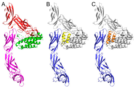 Predicted binding mode of ABD variants to the IL-23R. (A) The crystal structure of human IL-23/IL-23R complex (pdb id 5mzv) [29] showing the IL-23R in magenta, the IL-23 subunit p19 in green, and the IL-12 subunit p40 of IL23 in red. (B) The most probable predicted binding mode of the REX115 (yellow) to the murine IL-23 model (blue) overlapping with the position of IL-23 (grey) from the human IL-23/IL-23R complex. (C) The most probable predicted binding mode of the REX125 (orange) to the murine IL-23 model (blue).