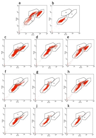 Flow cytometric analysis of E. coli differently packaged before and after different pressure treatments. Negative (a) and positive (b) E. coli cells; Vacuum-packed (c), CO2-packed (d), and N2-packed (e) E. coli cells after HHP treatment at 250 MPa: Vacuum-packed (f), CO2-packed (g), and N2-packed (h) E. coli cells after HHP treatment at 350 MPa; Vacuum-packed E. coli cells (i), CO2-packed (j) and N2-packed (k) E. coli cells after HHP treatment at 450 MPa.