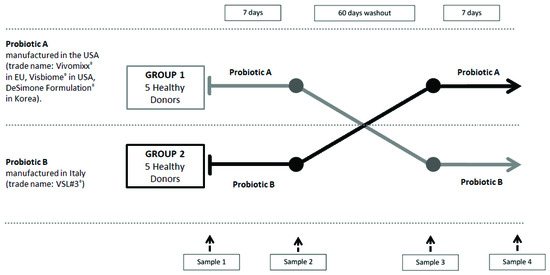 The present study was a cross-over, pilot study and included 10 healthy individuals divided in 2 groups (group 1 and 2). All subjects were enrolled at the Clinic of the Department of Public Health and Infectious Diseases of University of Rome “Sapienza”. The study protocol was approved by the internal committee of the Department of Public Health and Infectious Diseases of “Sapienza” University of Rome and by the Ethics Committee of Policlinico Umberto I Hospital, Rome (Rif. C.E. 2970). All participants agreed by signing a written informed consent form to be treated for a week with a probiotic, then to observe a period of eight weeks of wash out, and then to be treated again with a formulation different from the one they were treated previously. We collected 40 samples of feces and for each subject four samples, two before and two after the treatments (Figure 1).