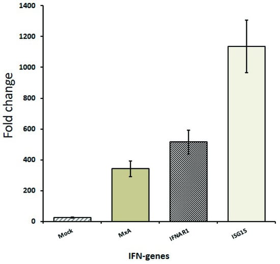 Quantitative real-time PCR for MxA, ISG15 and IFNAR1 was carried out with the LightCycler 480 instrument (Roche, Basel, Switzerland). Briefly, the total RNA was extracted from A549 cells using the RNeasy Plus Universal Tissue Mini Kit (Invitrogen, Carlsbad, CA, USA) and reverse transcribed using the High Capacity cDNA Reverse Transcription Kit (Applied Biosystems, Foster City, CA, USA), according to the manufacturer’s protocol. Primers and probes for each gene were added to the Probes Master Mix (Roche, Basel, Switzerland) at 500 nM and 250 nM, respectively, in a final volume of 20 μL. The housekeeping gene β-glucuronidase was used as an internal control. Gene expression values were calculated by the comparative Ct method using the equation 2-ΔΔCt (ΔΔCt method) [14]. The list of primers and probes is as follows: ISG15 (Forward: 5′-TGGCGGGCAACGAATT-3′, Reverse: 5′-GGGTGATCTGCGCCTTCA-3′, Probe: 5′-[6 carboxyfluorescein(6FAM)]TGAGCAGCTCCATGTC [tetramethylrhodamine(TAM)]-3′); MxA: (Forward: 5′-CTGCCTGGC AGAAAACTTACC-3′; Reverse: 5′-CTCTGTTATTCT CTGGTGAGTCTCCTT-3′; Probe: 5′-[6FAM]CATCAC ACATATCTGTAAATCTCTGCCCCTGTTAGA[TAM]-3′) and β-glucuronidase: (Forward: 5′-TCTGTCAAGGGCAGTAACCTG-3′, Reverse: 5′-GCCCACGACTTTGTTTTCTG-3′, Probe: 5′-(6FAM)TATGTCTTTCGATATGCAGCCAAGTTTTACCG3′(TAM)-3′). Primers and probe sequences used for IFNR1 (Hs. PT.58.25402720.g) were purchased from Integrated DNA Technologies (IDT), Iowa, USA. Each experiment was run in triplicate.