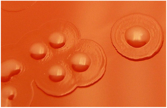 Moraxella can be isolated in culture on trypticase soy agar supplemented with 5% sheep blood (5% SB) and chocolate agar. Our laboratory recommends that ocular collection be placed directly to the media. Growth is better on 5% SB, but growth is generally slow with colonies not appearing until 48 h of incubation at 37 °C in 6% CO2. The initial appearance can be pinpoint colonies with larger colonies (2–3 mm) appearing after 2 days. Most Moraxella (not M. catarrhalis) isolated from ocular specimens will appear as grey to white colonies, often with a clearer beach and umbonate colony morphology, giving a fried egg appearance (Figure 2). To be included in this study, the Moraxella isolates had to be cultured from the cornea, conjunctiva, or an intraocular tap.