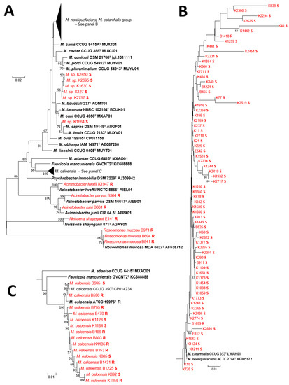 A diagram of the neighbor joining tree of 16S rRNA sequences for the Moraxella isolates in the study. Panel (A) details the neighbor joining tree (25) constructed with all sequences from this study and relevant type strains. Clades corresponding to M. nonliquefaciens/M.catarrhalis and M. osloensis are condensed. Panel (B) depicts clades corresponding to M. nonliquefaciens/M.catarrhalis. Panel (C) corresponds to M. osloensis. Red indicates strains from our clinical collection and black indicates select type strains. The vancomycin susceptibility status is indicated as S for susceptible and R for resistant.