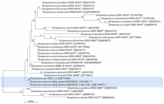 Phylogenetic characterization of the Streptomyces strains using a neighbor joining model. Light blue: experimentally compared Streptomyces strains. Bootstrap = 1000; Bootstrap values are shown on the branch, where 100 is maximum; T: type strain; NCBI access number is within parenthesis. * Streptomyces griseus subsp. griseus DSM 40236T LAB COLL: Sequence experimentally obtained from fresh cultures and deposited in NCBI (MK734067). ** Streptomyces griseus subsp. griseus DSM 40236T: Sequence retrieved from NCBI (M76388). The evolutionary distances were computed using the Jukes-Cantor method and are in the units of the number of base substitutions per site (scale). The analysis involved 31 nucleotide sequences. All positions containing gaps and missing data were eliminated. There were a total of 1338 positions in the final dataset.