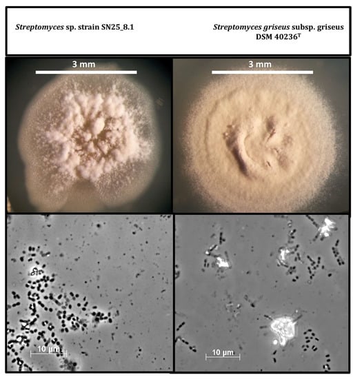 After cultivation of the strains in solid GYM medium for three weeks, we continued with a morphological comparison of the Easter Island Streptomyces sp. SN25_8.1 and the type strain, Streptomyces griseus subsp. griseus DSM 40236T (Figure 2). The visual comparison showed evident macroscopic differences between the strains, such as; spore pigmentation, amount of spore formation, and aerial hyphae distribution on the colony. Light microscopic examination of the cells and spores of both strains showed no differences. Nevertheless, a detailed characterization of the spores and spore-bearing hyphae would require scanning electron microscopy.