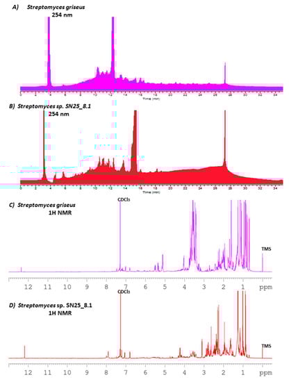 HPLC metabolite profile comparison of Streptomyces sp. SN25_8.1 from Easter Island, and Streptomyces griseus subsp. griseus DSM 40236T from Russia, measured at 254 nm (A,B), and 1H NMR comparison of the crude extract of both strains (C,D). CDCl3: deuterated chloroform; TMS: tetramethylsilane.