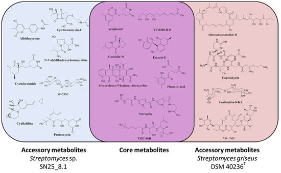 Chemical diversity of the studied Streptomyces representatives. Core metabolites: Metabolites shared by both strains. Accessory metabolites: Unique metabolites for each of the studied strains.