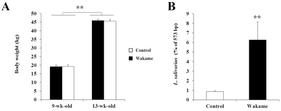 Effect of wakame feeding on body weight gain and gut microbiota of pigs. (A) Body weight of pigs at the beginning (9 weeks-old pigs) and the end (13 weeks-old pigs) of dietary intervention. (B) Proportion of Lactobacillus salivarius population in the porcine gut microbiota estimated by terminal restriction fragment length polymorphism (T-RFLP) method followed by sequence (573 bp) alignment using MAFFT tool. Asterisks (**) indicate statistical differences between wakame-fed and control groups with a significant level of p < 0.01.