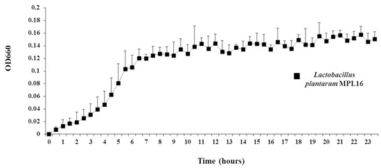 The LAB isolates used for in vitro wakame assimilation study were first grown in deMann Rogosa and Sharpe (MRS) agar at 37 °C for 24 h. After that, 200 μL of this fermentation broth was subjected for sub-culture into the newly developed wakame-broth and incubate at 37 °C for 24 h. Starter culture was inoculated into 5 mL of three same wakame broth using L-shaped test tubes with optical density (OD) = 0.5 inoculated over time (measurement interval: 30 min, penetration rate: 60 rpm, total operation time: 24 h) (TVS026CA, Advantec, Tokyo, Japan). To test the acid survivability of LAB isolates, each sample in the fermentation broth was drawn at regular intervals of 6 h for estimation of viable cell counts and pH of the medium.