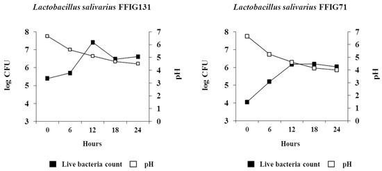 Change of pH and viable bacterial counts of Lactobacillus salivarius wakame assimilating isolates in the newly developed wakame-component adjusted media. Lactobacillus salivarius FFIG71 is the strongest wakame-utilizing and anti-inflammatory isolate (based on OD and IL-6 expression values presented in Table S3). Lactobacillus salivarius FFIG131 is the strongest wakame utilizing and antiviral isolate (based on OD and IFN-β expression values presented in Table S3). Both isolates were cultured in newly developed wakame broth for 24 h and pH of the medium and viable bacterial count was estimated to evaluate the bacterial growth on the medium.