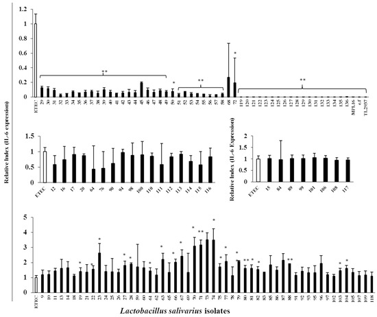 The potential immunomodulatory capacities of all the 128 LAB isolated colonies were evaluated in a PIE cell model. For this purpose, PIE cells were pre-stimulated with each isolate for 48 h, followed by ETEC challenge for 12 h for TLR4 stimulation [18]. Then, the expression of IL-6 was measured. Taking into consideration the changes in the levels of IL-6 expression, lactobacilli isolates were divided into four groups: 50 L. salivarius isolates with the ability to strongly decrease IL-6, 15 L. salivarius isolates that moderately decreased this cytokine, 55 strains that increased IL-6, and 8 isolates with no effect on IL-6 expression in PIE cells after ETEC challenge (Figure 4).