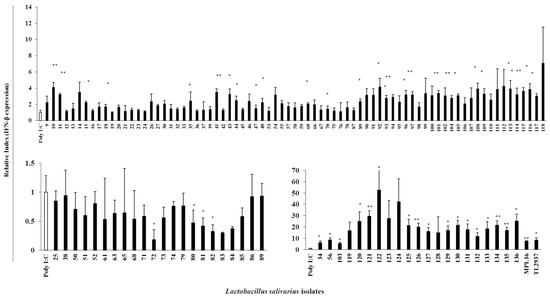 In addition, the ability of LAB isolates to modulate TLR3-mediated immune responses in PIE cells was evaluated by measuring IFN-β expression after poly(I:C) challenge. Result revealed that 23 L. salivarius isolates increased this type I interferon while 9 isolates had no effect. Moreover, 22 and 60 isolates strongly and moderately reduced IFN-β expression in PIE cells after poly(I:C) challenge, respectively (Figure 5).