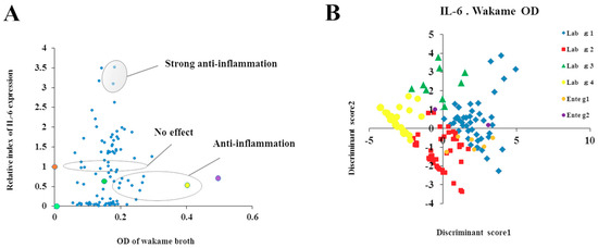Discriminant analysis of wakame assimilation and immunoregulatory activity of isolates. (A) Relationship between IL-6 expression modulation and wakame assimilation (OD) of Lactobacillus salivarius isolates. (B) Discrimination of conveniently categorized groups of bacterial isolates estimated by discriminant function analysis based on IL-6 expression and wakame assimilation.