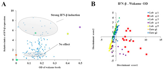 Discriminant analysis of wakame assimilation and immunoregulatory activity of isolates. (A) Relationship between IFN-β expression modulation and wakame assimilation (OD) of Lactobacillus salivarius isolates. (B) Discrimination of conveniently categorized groups of bacterial isolates estimated by discriminant function analysis based on IFN-β expression and wakame assimilation.