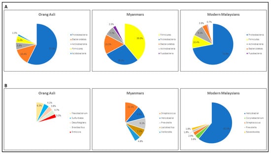 Bacterial phyla and genera compositions in Orang Asli, Myanmar and modern Malaysian non-ulcerative dyspepsia (NUD) patients. (A) Mean relative abundances of the five most predominant bacterial phyla in each population. (B) Mean relative abundances of the five most predominant bacterial genera in each cohort.
