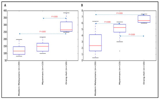 Alpha diversity analysis between Orang Asli, Myanmar and modern Malaysian groups diagnosed with NUD. (A) Alpha diversity estimation based on species richness index. (B) Alpha diversity estimation based on Shannon diversity index.