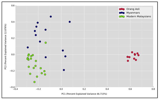 Beta diversity analysis between Orang Asli, Myanmar and modern Malaysian groups diagnosed with NUD. Principal coordinate analysis (PCoA) plot based on Jaccard index (R = 0.75, p < 0.001).